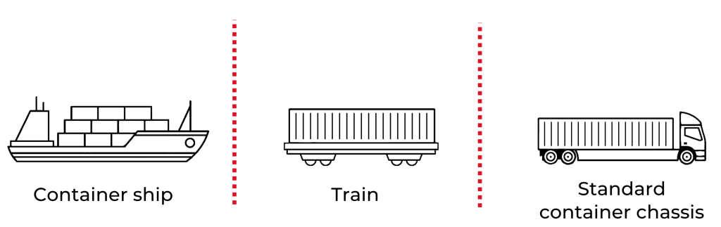The product is then transported via container shipping, short-sea shipping, train, or standard container chassis, by choosing the most efficient mode of transport.